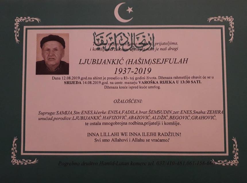 Tužnim srcem javljamo rodbini, prijateljima i komšijama da je dana 12.08.2019. u 83. godini života na Ahiret preselio Ljubijankić (Hašim) Sejfulah.