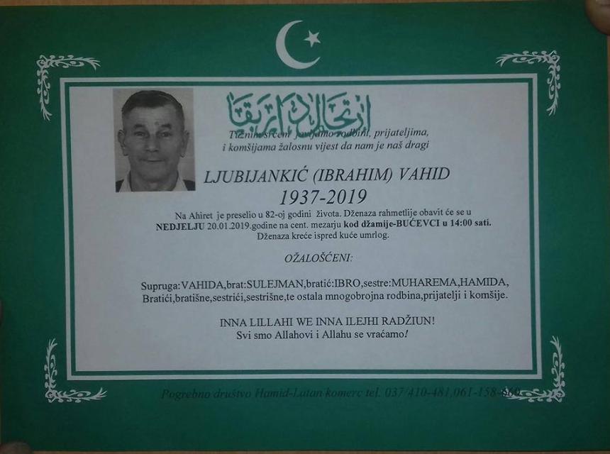 Dženaza namaz obavit će se u nedjelju 20.10.2019.g. na cent. mezarju kod džamije Bućevci u 14 h. Dženaza namaz kreće ispred kuće rahmetlije.