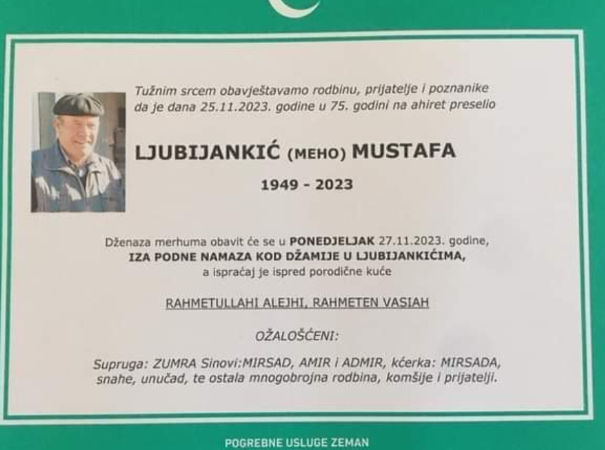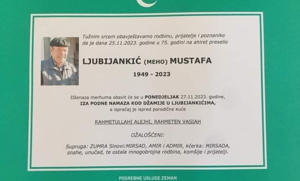 Dženaza merhuma obavit će se u PONEDJELJAK 27.11.2023. godine, IZA PODNE NAMAZA KOD DŽAMIJE U LJUBIJANKIĆIMA, a ispraćaj je ispred porodične kuće.