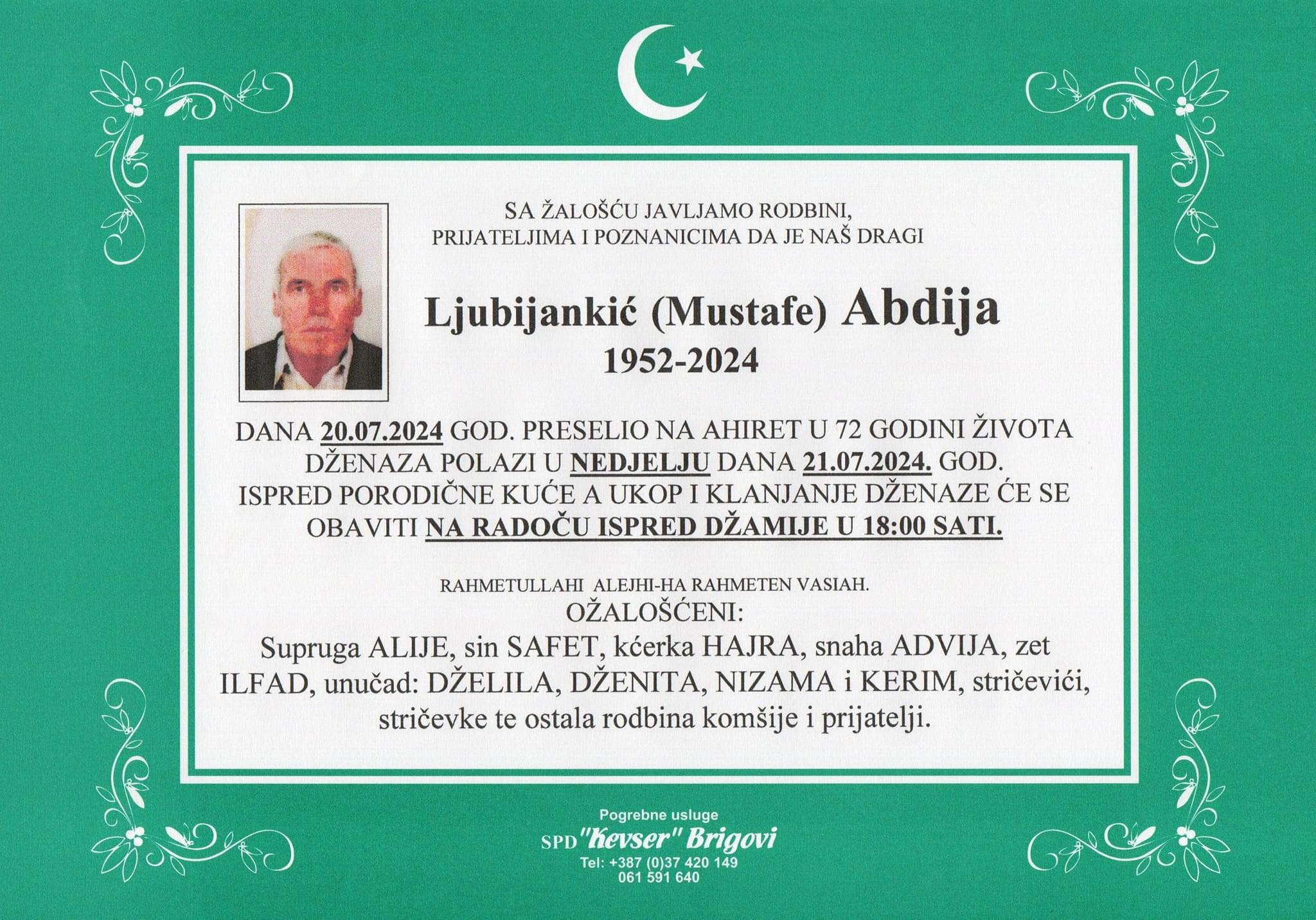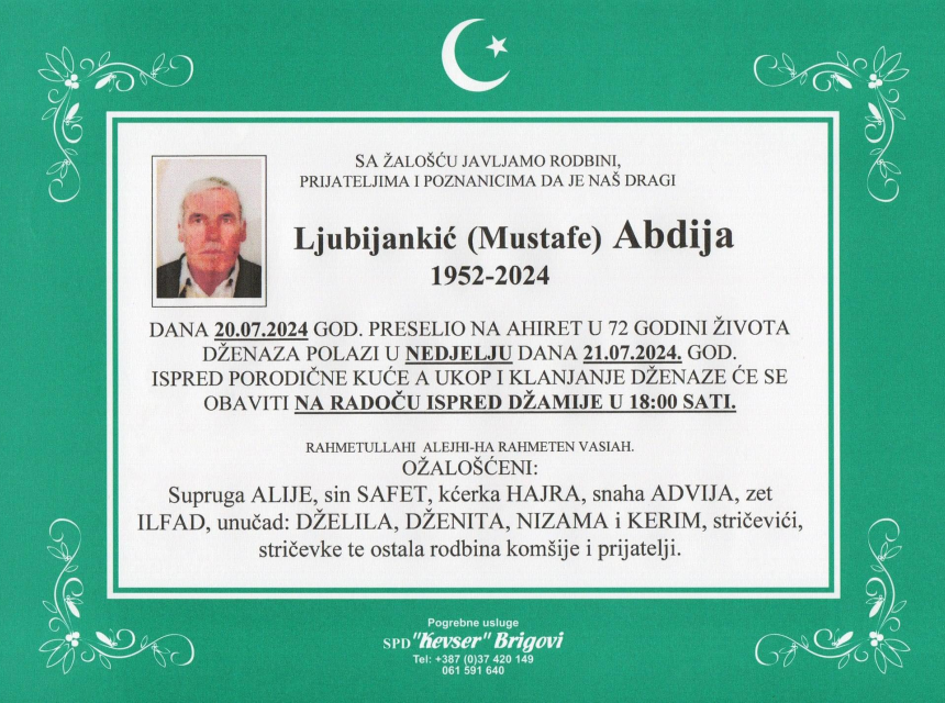 Obavještavamo rodbinu, prijatelje, poznanike i komšije da je dana 20. 07. 2024 god. u 72-oj godini života na ahiret je preselio Ljubijankić (Mustafe) Abdija.
