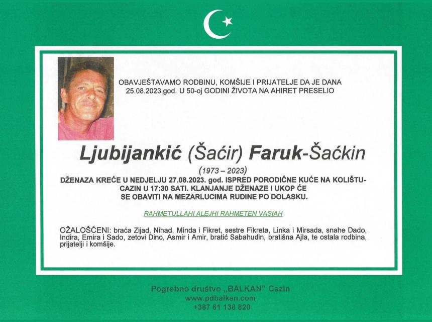 Tuznim srcem javljamo rodbini, prijateljima i poznanicima da je dana 25.08.2023. godine u 50. godini zivota na ahiret preselio nas dragi Ljubijankić (Šaćir) Faruk - Šaćkin.