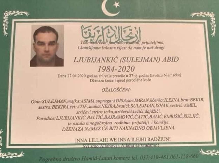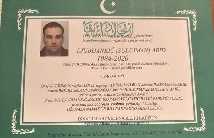 Tužnog srca i s bolom u duši javljamo rodbini, komšijama i prijateljima da je naš dragi Ljubijankić (Sulejman) Abid, dana 27.04. 2020. godine u 37-oj godini života preselio na Ahiret u Njemačkoj.