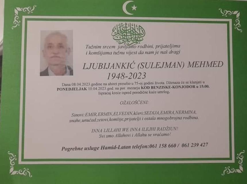 Tužnim srcem javljamo rodbini, prijateljima i poznanicima tužnu vijest da nam je naš dragi Ljubijankić (Sulejman) Mehmed na Ahiret preselio dana 08.04.2023. godine u 75-oj godini.