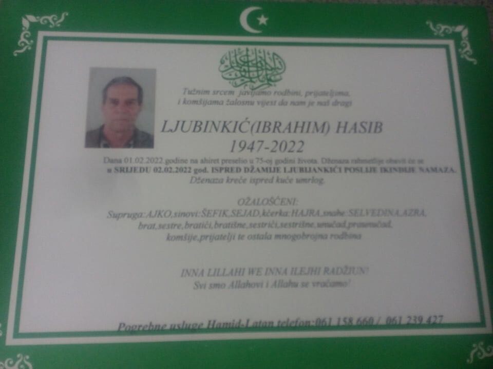 Tužnog srca i s bolom u duši obavještavamo rodbinu, komšije i prijatelje da je naš dragi Ljubinkić (Ibrahim) Hasib 1.02.2022. u 75. godini života preselio na ahiret.