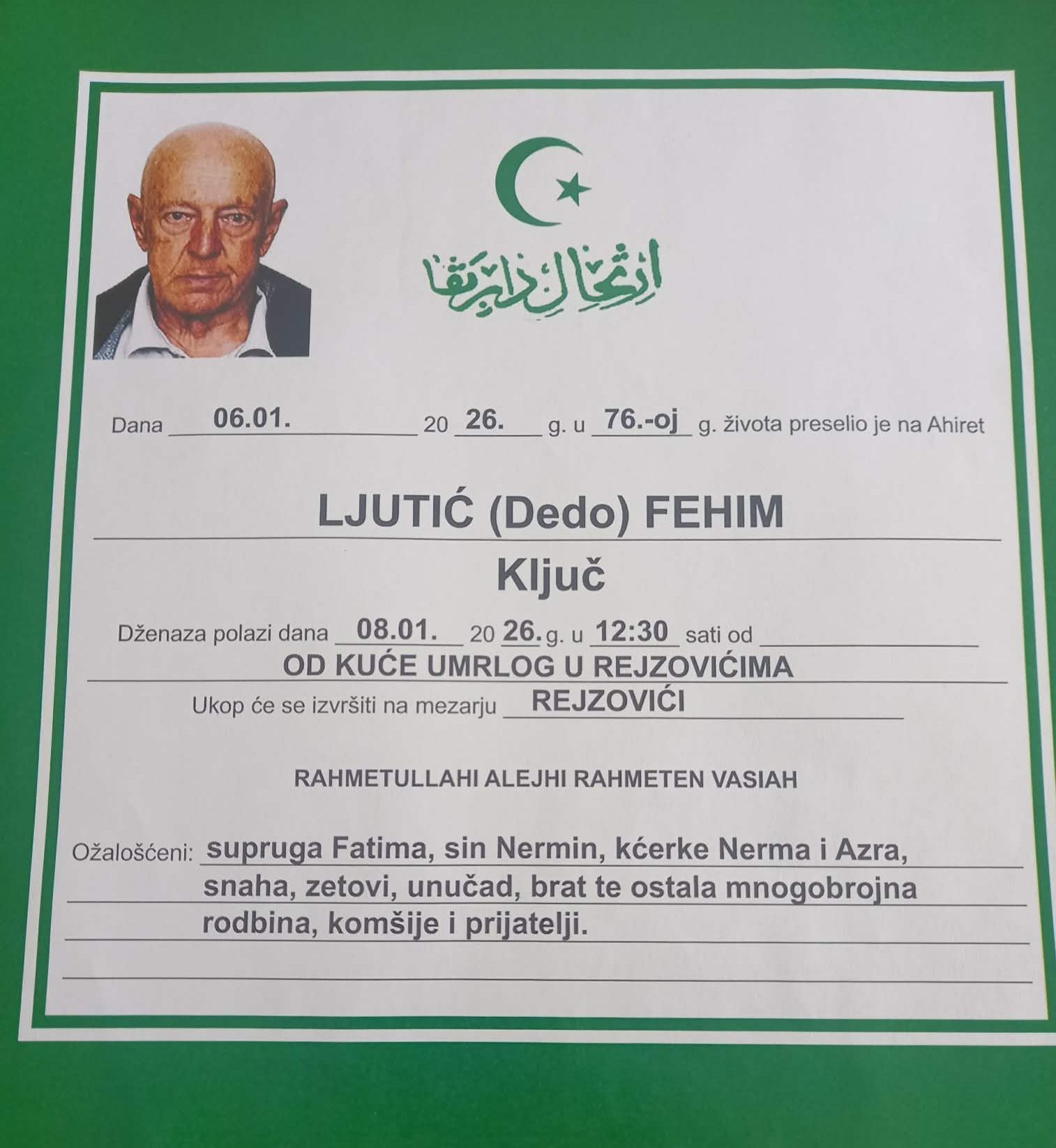 Dana 06.01. 2026 godine.u 76.-0j. godini života preselio je na Ahiret LJUTIĆ (Dedo) FEHIM.