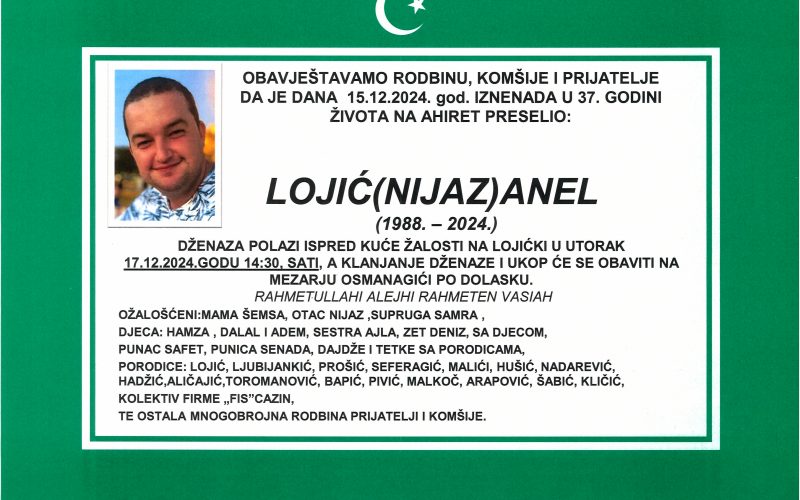 Dženaza polazi ispred kuće žalosti na Lojićki u utorak, 17.12.2024. godine u 14:30 sati, dok će klanjanje dženaze i ukop biti obavljeni na mezarju Osmanagići po dolasku.