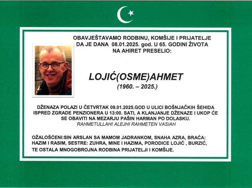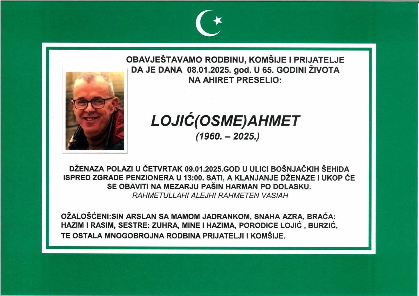 Duboko ožalošćeni obavještavamo rodbinu, prijatelje i komšije da je dana 08.01.2025. god. u 65-oj godini života na ahiret preselio Lojić (Osme) Ahmet.