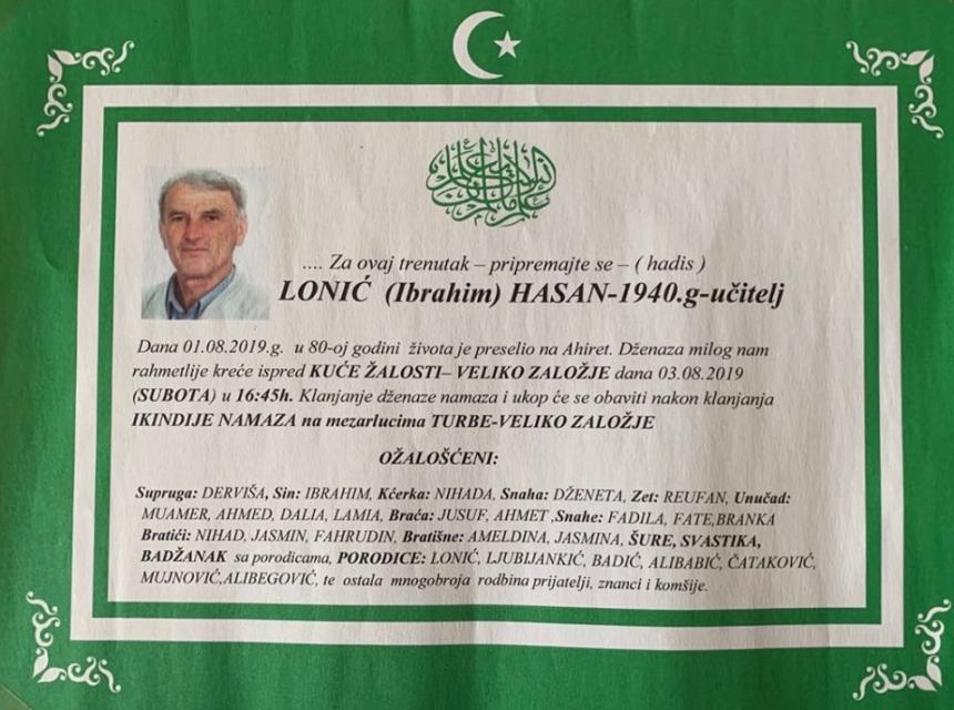 Tužnim srcem i bolom u duši javljamo rodbini, prijateljima i komšijama da je dana 01.08.2019. godine u 80-toj godini života na Ahiret preselio Lonić (Ibrahim) Hasan - učitelj.