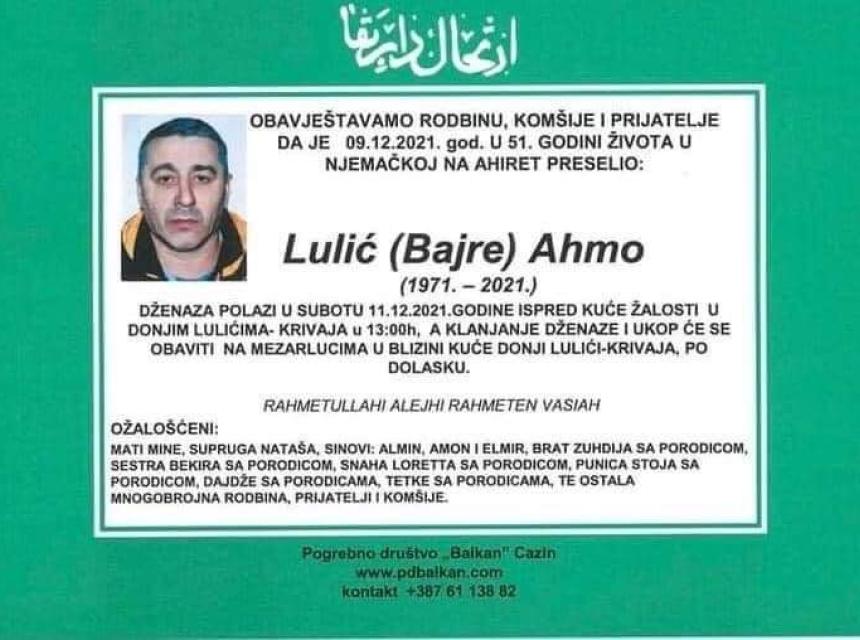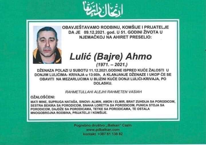 Tužnog srca i s bolom u duši obavještavamo rodbinu, komšije i prijatelje da je naš dragi Lulić (Bajre) Ahmo dana 09.12.2021. u 51. godini života preselio na ahiret.