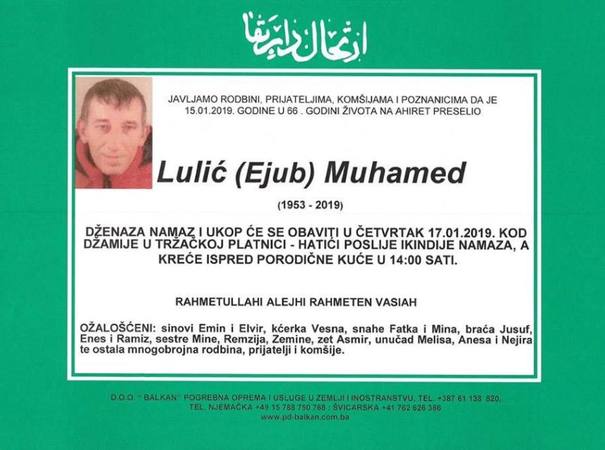 Sa žalošću javljamo rodbini, prijateljima i poznanicima, da je naš dragi Lulić (Ejub) Muhamed dana 15.01.2019. godine preselio na Ahiret u 66. godini života.