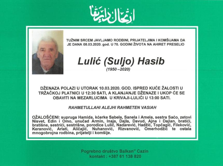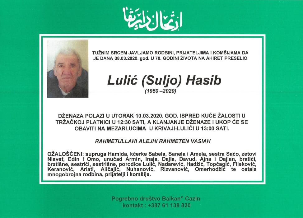 Tužnim srcem javljamo rodbini, prijateljima i komšijama da je dana 08.03.2020. god. u 70. godini života na Ahiret preselio Lulić (Suljo) Hasib.