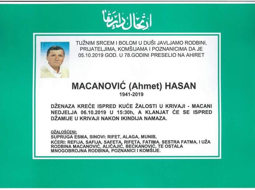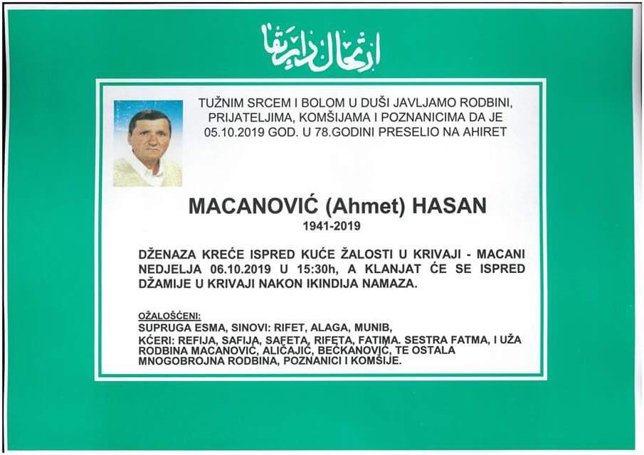 Tužnim srcem i bolom u duši javljamo rodbini, prijateljima, komšijama i poznanicima da je 05.10.2019. godine u 78.-oj godini života na Ahiret preselio Macanović (Ahmet) Hasan.