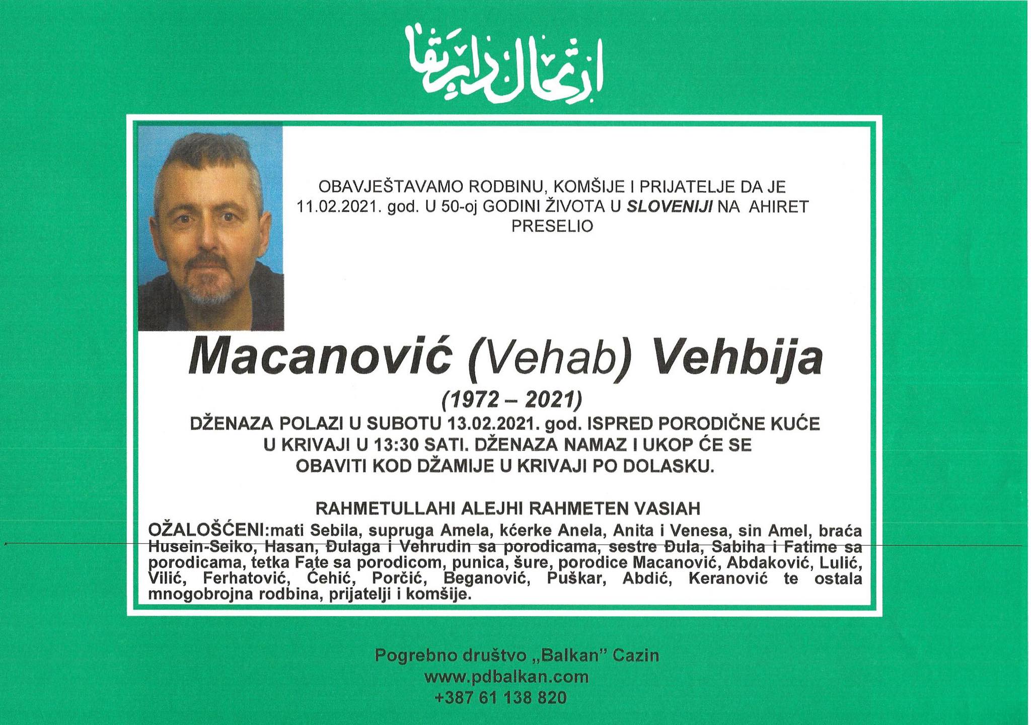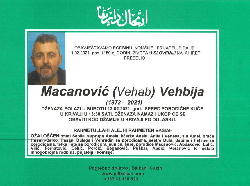 Tužnog srca i s bolom u duši obavještavamo rodbinu, komšije i prijatelje da je naš dragi Macanović (Vehab) Vehbija, dana 11.02.2021. godine, u 50-oj godini života, preselio na Ahiret.