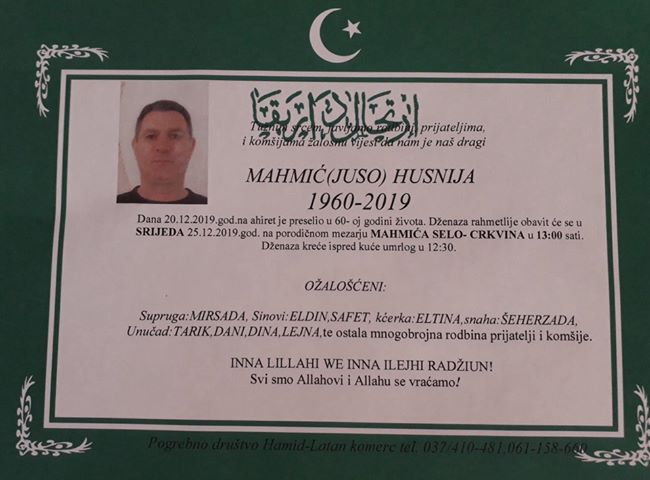 Dženaza će se obaviti u srijedu, 25.12.2019. godine, u 13: h na porodičnom mezarju MAHMIĆA SELO-CRKVINA. Dženaza kreće ispred kuće umrlog u 12:30 h.