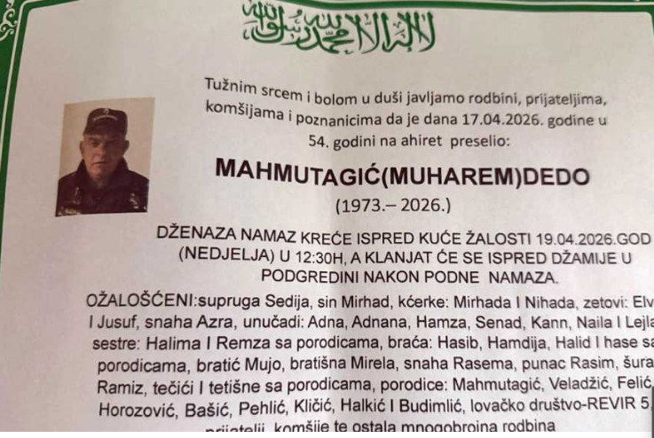 Dženaza-namaz kreće ispred kuće žalosti 19.04.2026. godine (nedjelja) u 12:30h, a klanjat će se ispred džamije u Podgredini nakon podne namaza.