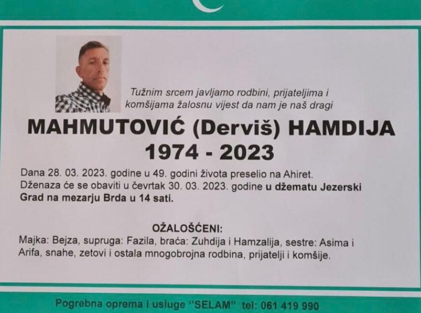 Tužnim srcem javljamo rodbini, prijateljima i poznanicima da je naš dragi Mahmutović (Derviš) Hamdija dana 28.03.2023. godine u 49-oj godini života na Ahiret preselio.