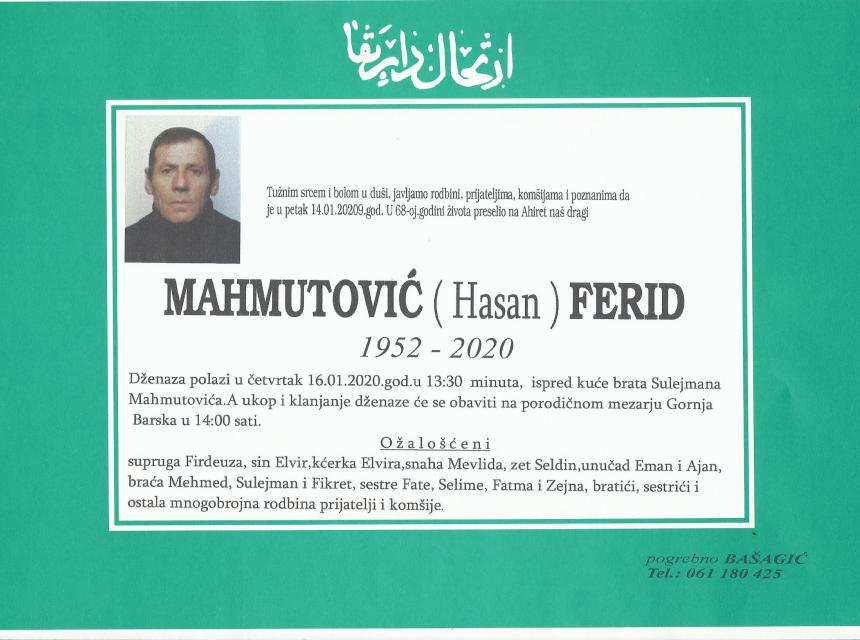 Tužnim srcem i bolom u duši javljamo rodbini i prijateljima da je dana 14.01.2020. godine u 68. godini života na Ahiret preselio Mahmutović (Hasan) Ferid.