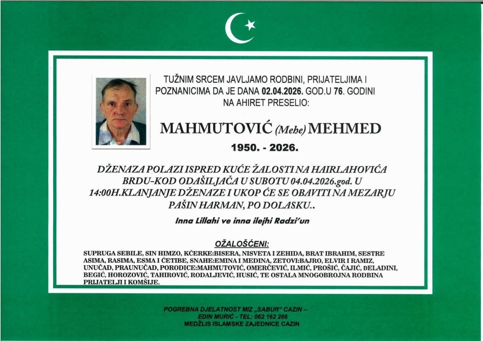 Dženaza polazi ispred kuće žalosti na Hairlahovića brdu – kod odašiljača, u subotu 04.04.2026. godine u 14:00 sati. Klanjanje dženaze i ukop će se obaviti na mezarju Pašin Harman, po dolasku.