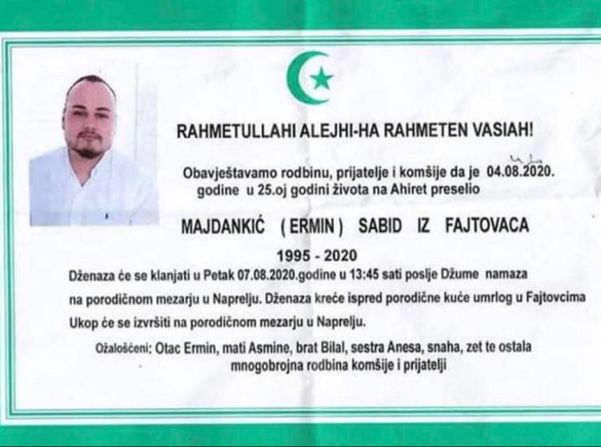 Tužnog srca i s bolom u duši obavještavamo rodbinu, komšije i prijatelje da je naš dragi Majdankić (Ermin) Sabid iz Fajtovaca, dana 4. avgusta 2020. godine, preselio na Ahiret u 25. godini života.