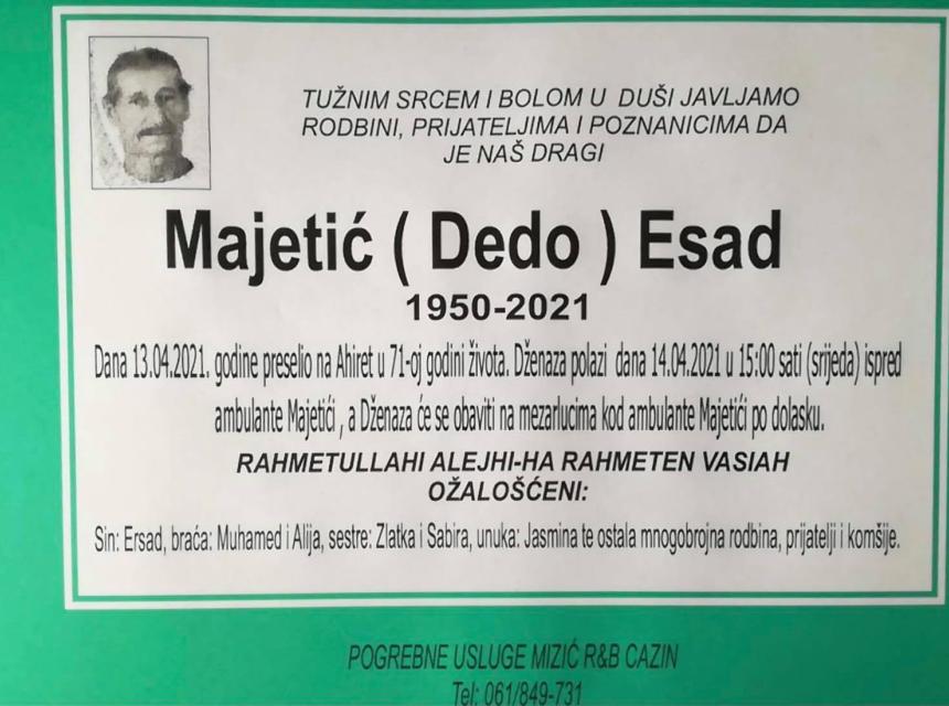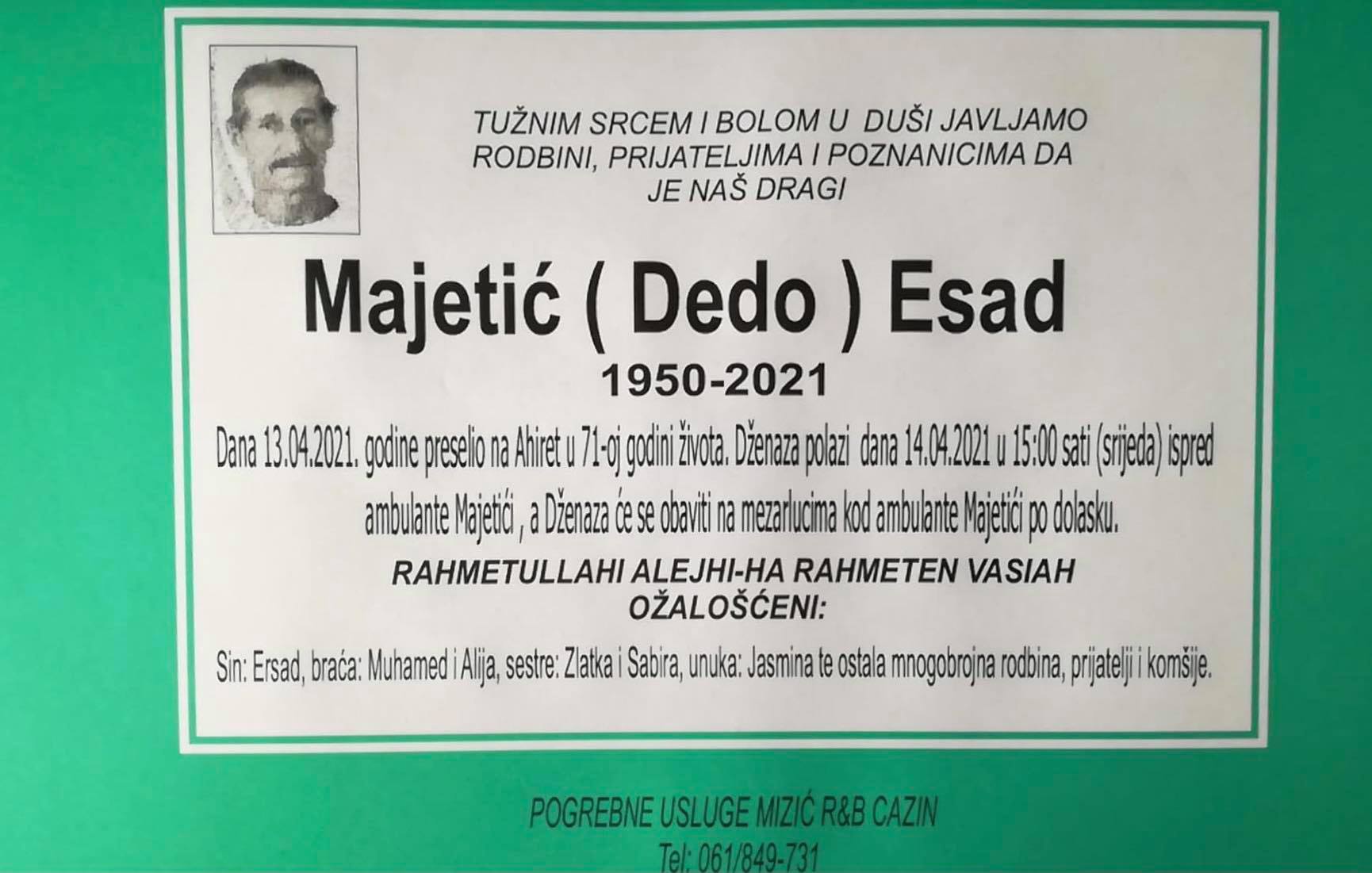 Dženaza polazi u srijedu, 14.04.2021. godine, u 15:00 sati ispred ambulante Majetići, a dženaza će se obaviti na mezarlucima kod ambulante Majetići po dolasku.