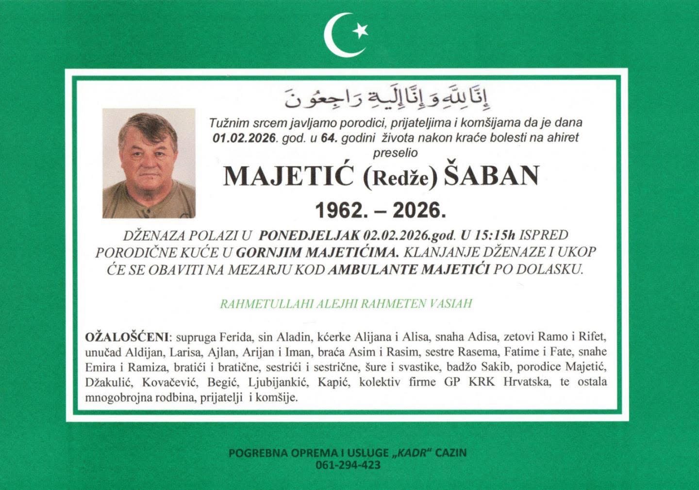 Dženaza polazi u ponedjeljak, 02.02.2026. godine, u 15:15 sati ispred porodične kuće u Gornjim Majetićima. Klanjanje dženaze i ukop obavit će se na mezarju kod Ambulante Majetići po dolasku.