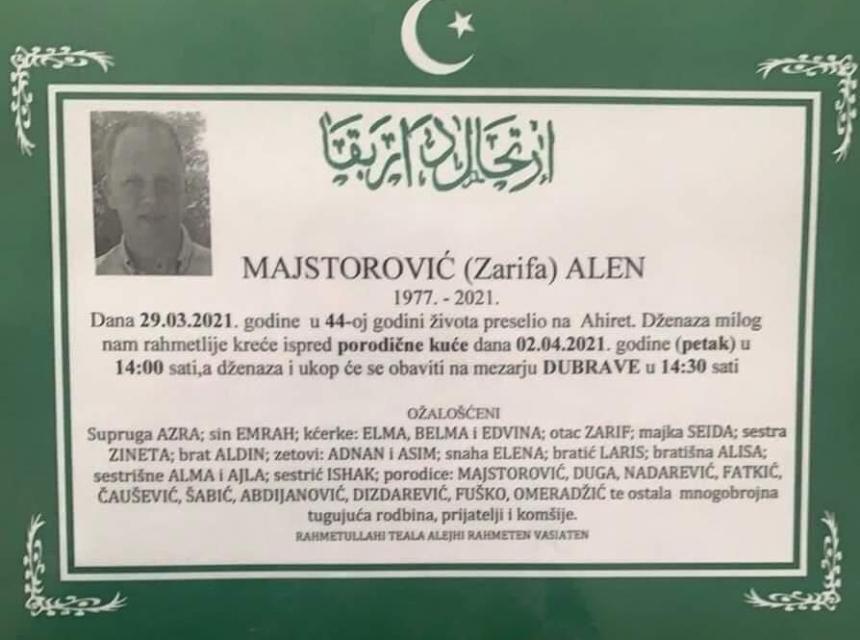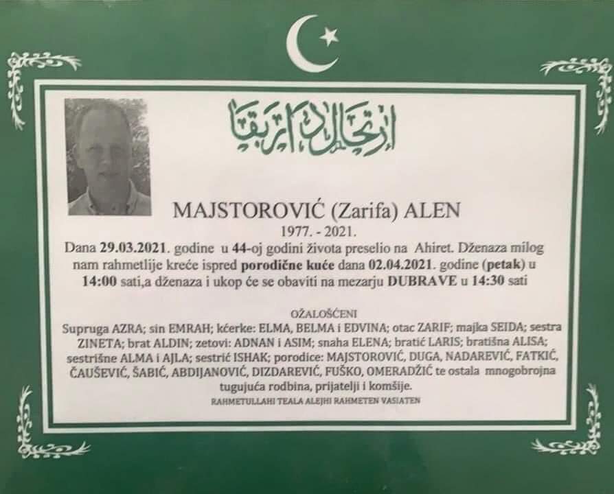Tužnog srca i s bolom u duši obavještavamo rodbinu, komšije i prijatelje da je naš dragi Majstorović (Zarifa) Alen 29.03.2021. godine, u 44. godini života preselio na Ahiret.
