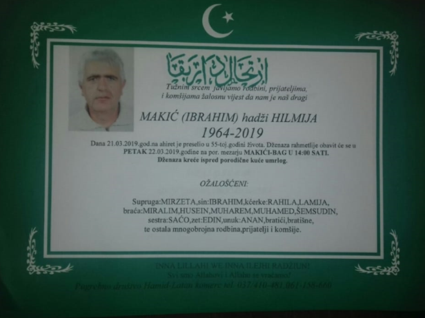 Obavještavamo rodbinu, komšije i prijatelje da je 21.03.2019. u 55-oj godini života na Ahiret preselio Makić (Ibrahim) hadži Hilmija.
