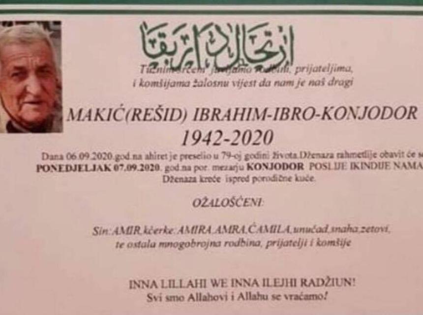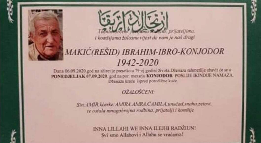 Tužnog srca i s bolom u duši obavještavamo rodbinu, komšije i prijatelje da je naš dragi Makić (Rešid) Ibrahim-Ibro dana 6. septembra 2020. godine, u 79. godini života, preselio na Ahiret.