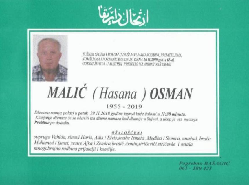 Sa žalošću javljamo rodbini, prijateljima i poznanicima da je dana 26.11.2019. godine na Ahiret u 65-oj godini života preselio na Ahiret malić(Hasana) Osman iz Stijene.