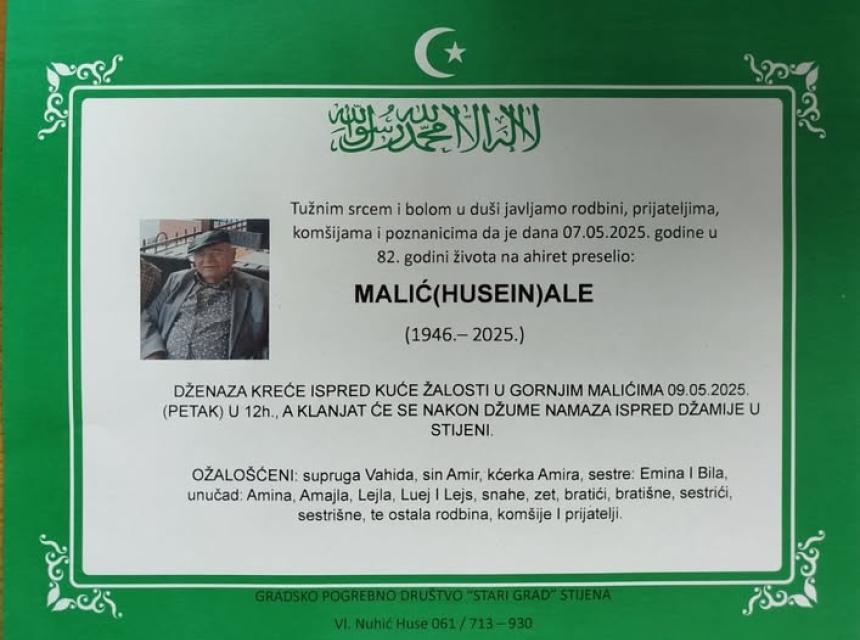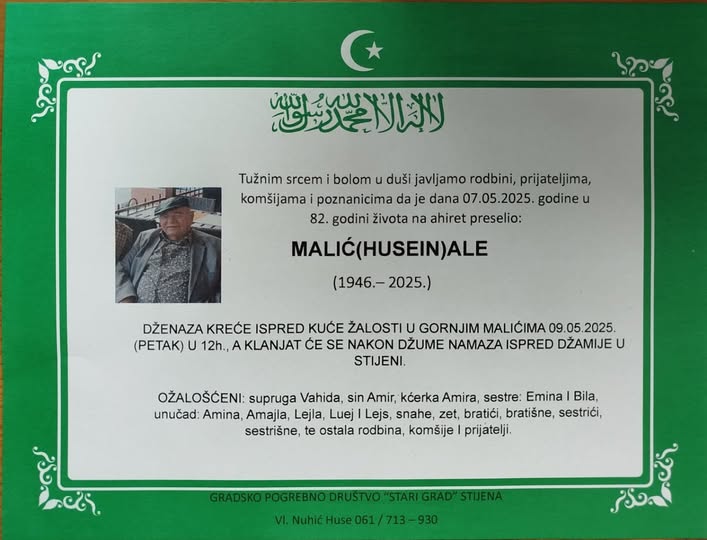 Tužnim srcem javljamo rodbini, prijateljima i znancima žalosnu vijest da je naš dragi Malić (Husein) Ale dana 07.05.2025. u 82. godini života preselio na ahiret.