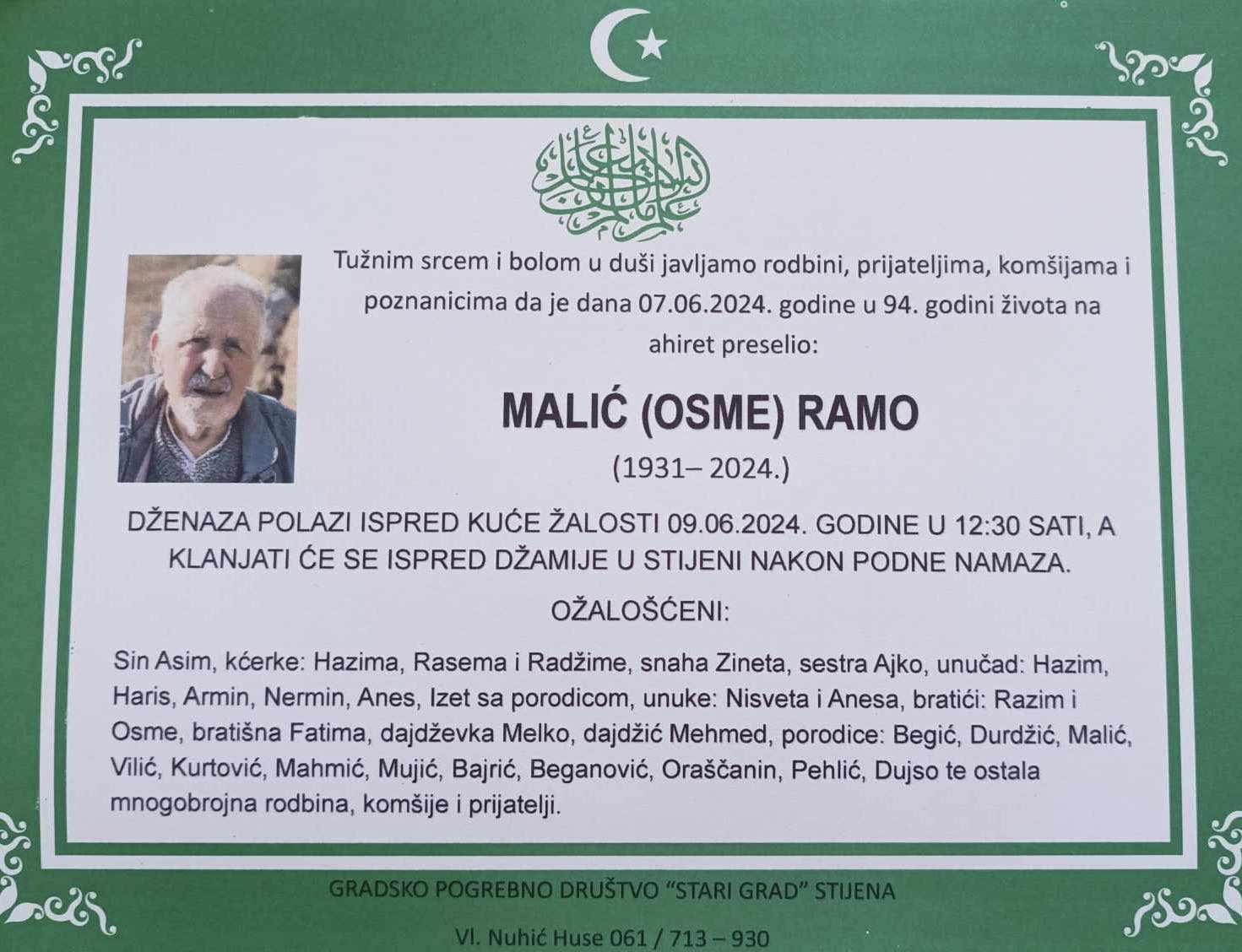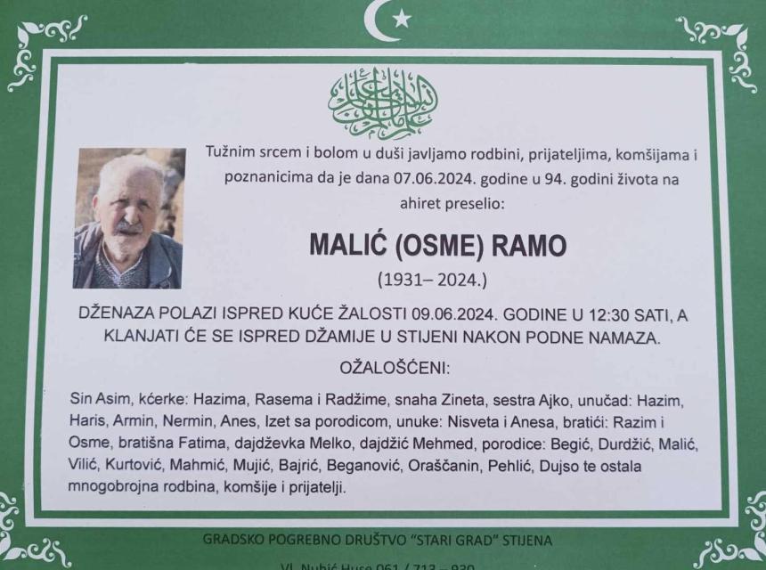 Tužnim srcem i bolom u duši obavještavamo rodbinu, prijatelje i komšije da je naš dragi Malić (Osme) Ramo, dana 07.06.2024. godine u 94-oj godini života, preselio na Ahiret.