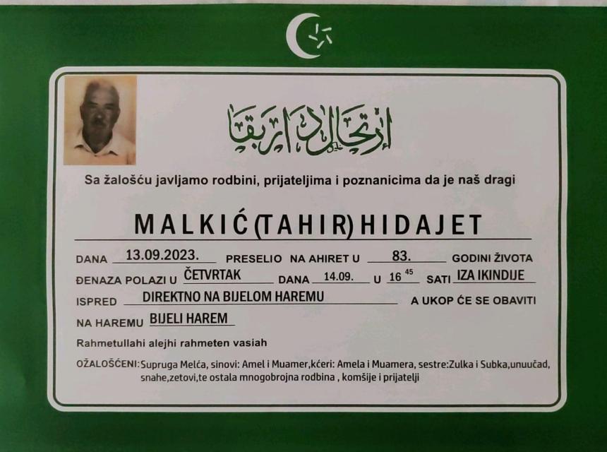 Tužnim srcem i bolom u duši javljamo rodbini, prijateljima i komšijama da je naš dragi Malkić (Tahir) Hidajet, dana 13.09.2023. godine u 83-oj godini života, preselio na Ahiret.