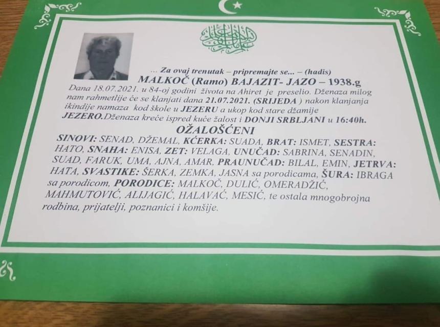 Tužnog srca i s bolom u duši obavještavamo rodbinu, komšije i prijatelje da je naš dragi Malkoč (Ramo) Bajazit- Jazo, dana 18.07.2021 godine, u 84-oj godini života, preselio na Ahiret.