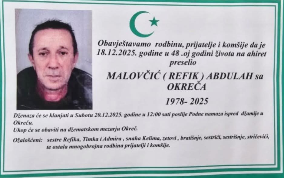 Dženaza će se klanjati u subotu, 20.12.2025. godine u 12:00 sati, poslije podne-namaza, ispred džamije u Okreču.