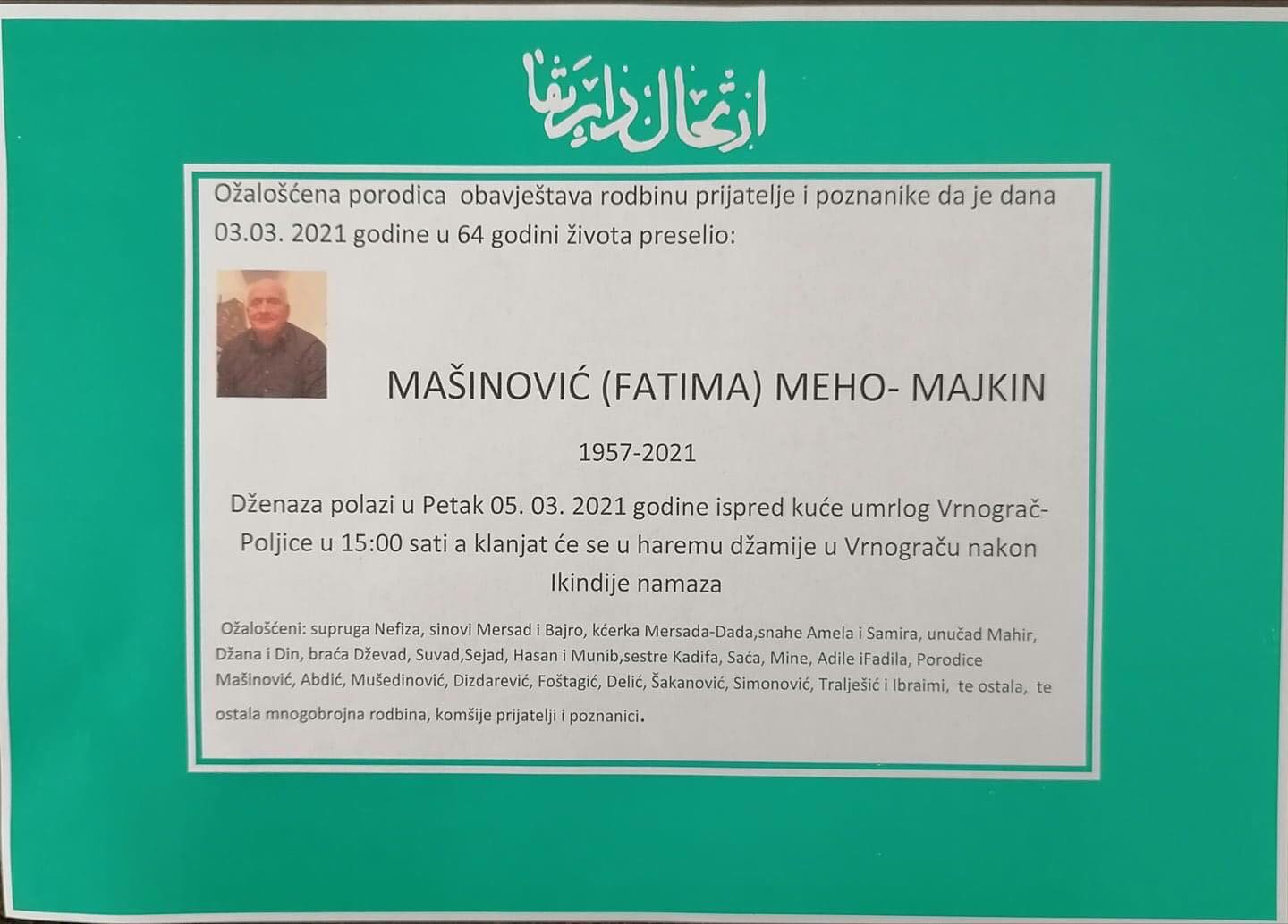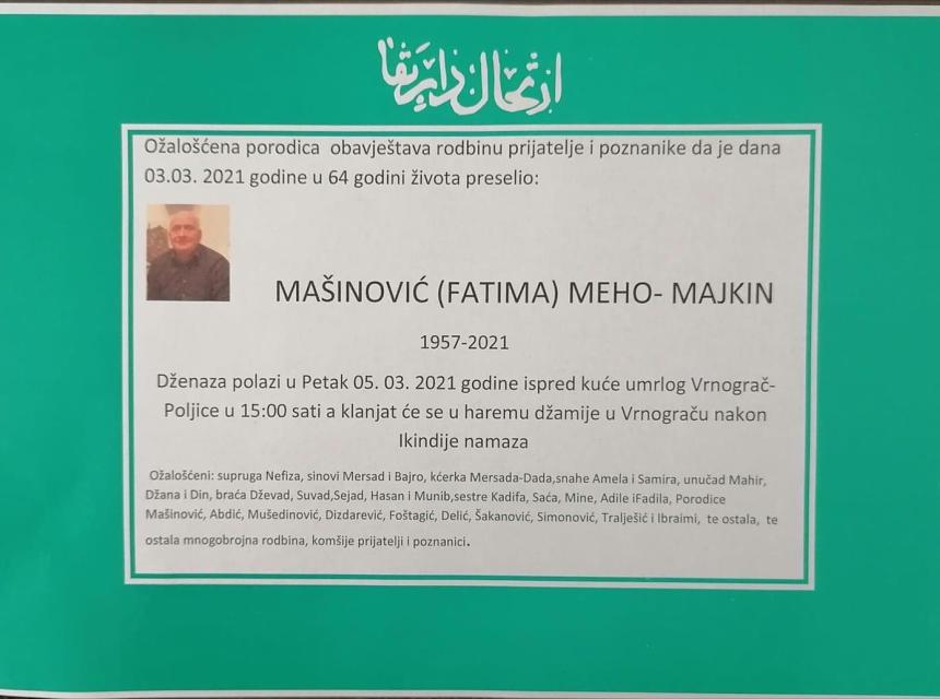 Tužnog srca i s bolom u duši obavještavamo rodbinu, komšije i prijatelje da je naš dragi Mašinović (Fatima) Meho - Majkin, dana 03.03.2021 godine, u 64-oj godini života, preselio na Ahiret.