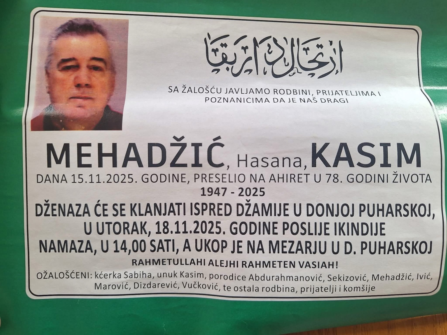 Dženaza će se klanjati ispred džamije u Donjoj Puharskoj, u utorak, 18.11.2025. godine, poslije ikindije-namaza, u 14:00 sati,