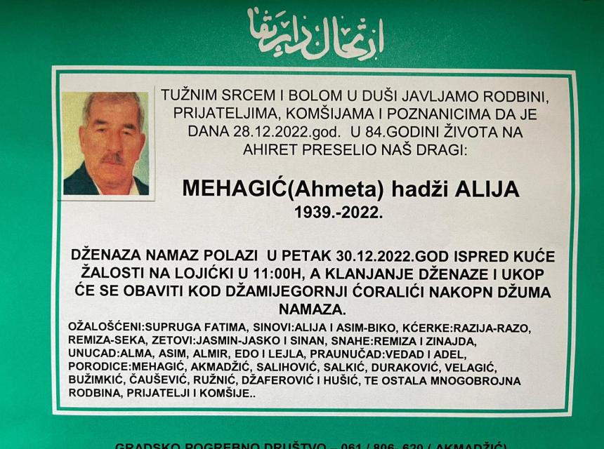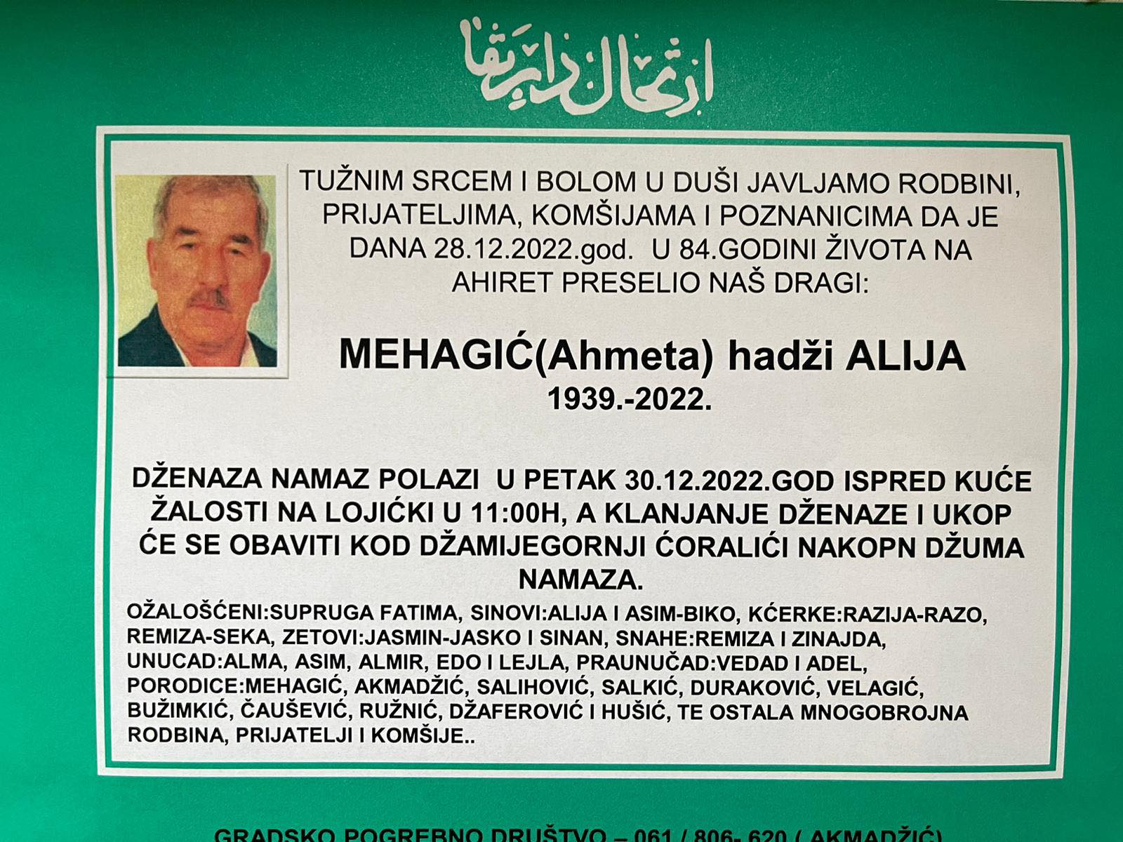 Tužnog srca i s bolom u duši obavještavamo rodbinu, komšije i prijatelje da je naš dragi Mehagić (Ahmeta) hadži Alija u 84-oj godini života, preselio na Ahiret.