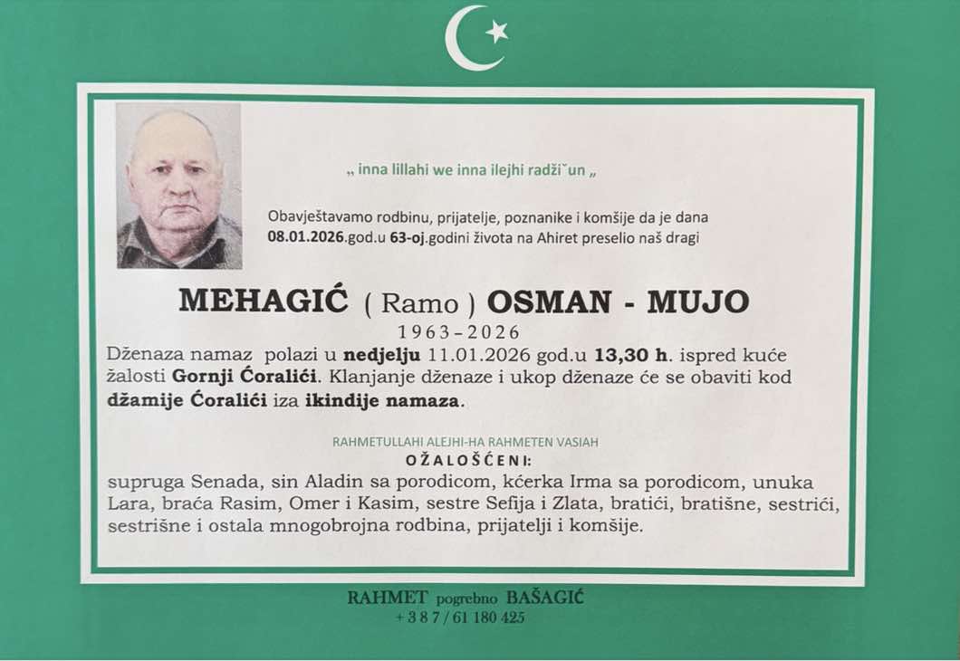 Tužnim srcem i bolom u duši javljamo rodbini, prijateljima i komšijama da je naš dragi Mehagić (Ramo) Osman - Mujo, dana 08.01.2026. godine u 63-oj godini života, preselio na Ahiret.