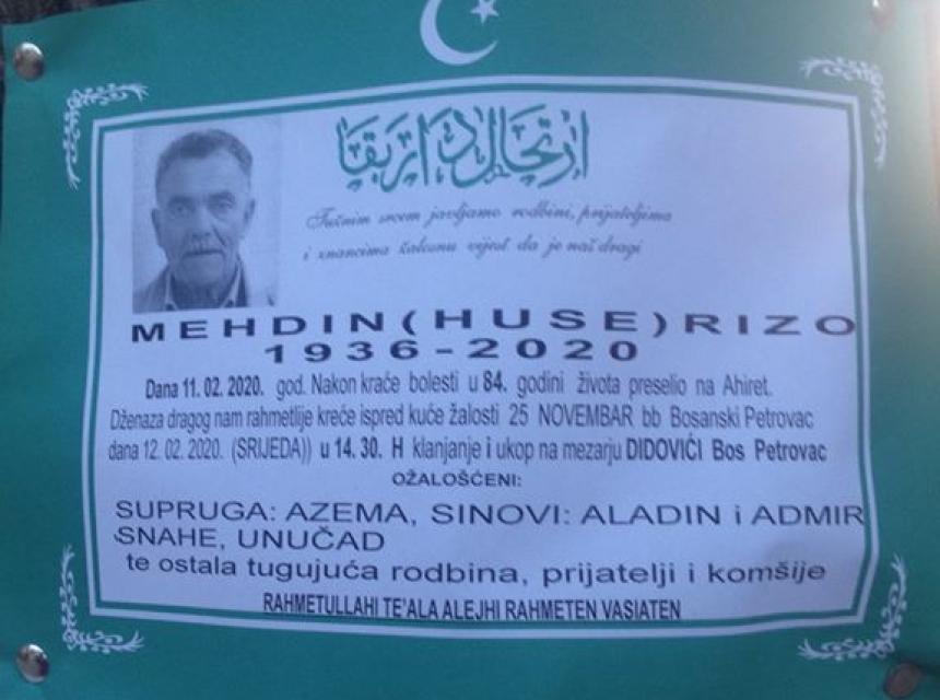 Tužnim srcem i bolom u duši javljamo rodbini i prijateljima da je naš Mehdin (Huse) Rizo dragi dana 11.02.2020. godine preselio na Ahiret u 84. godini života.