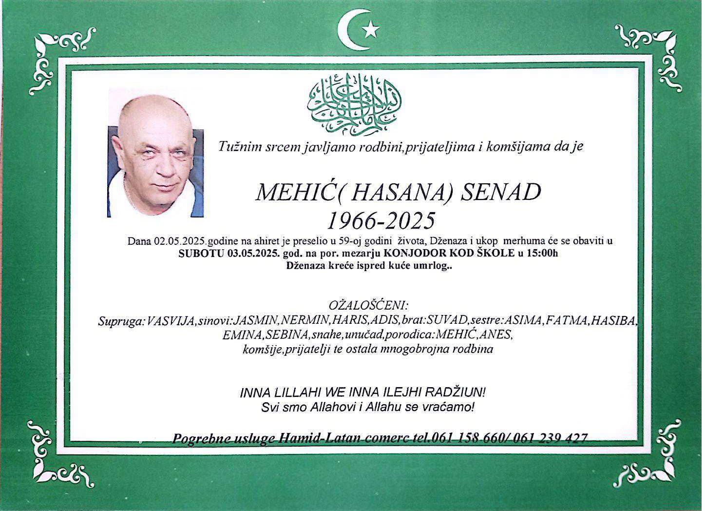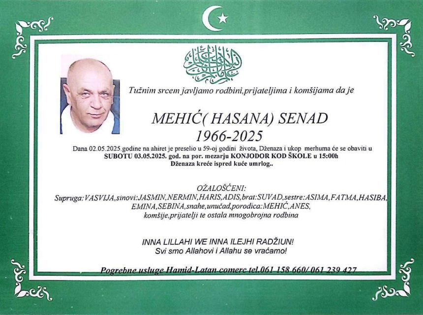 Tužnim srcem i bolom u duši javljamo rodbini, prijateljima i komšijama da je naš dragi MEHIĆ (Hasan) SENAD, dana 02.05.2025. godine u 59-oj godini života, preselio na ahiret.