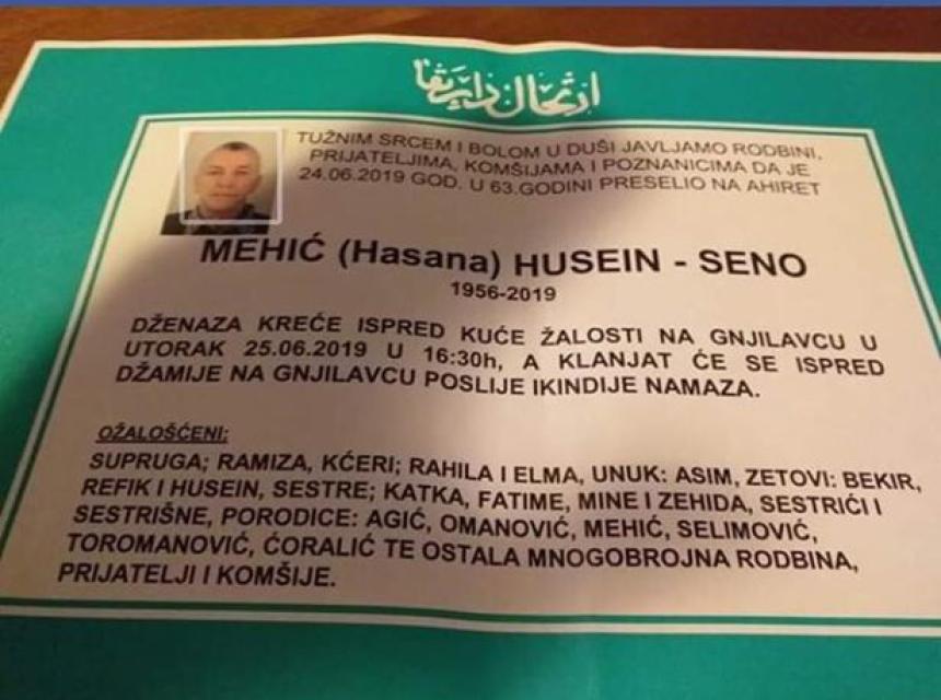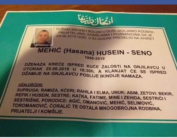 Obavještavamo rodbinu, komšije i prijatelje da je dana 24.06.2019. godine u 63. godini života na Ahiret preselio Mehić (Hasana) Husein - Seno.