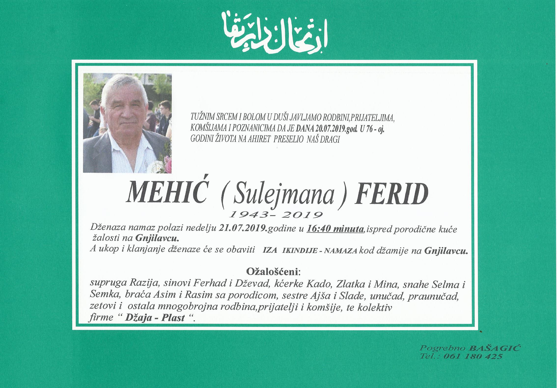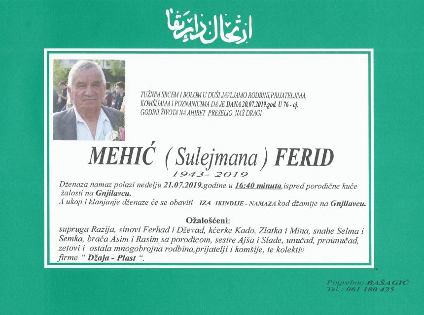 Tužnim srcem i bolom u duši javljamo rodbini, prijateljima, komšijama i poznanicima da je dana 20.07.2019. god. u 76-oj. godini života na Ahiret preselio naš dragi Mehić (Sulejmana) Ferid.