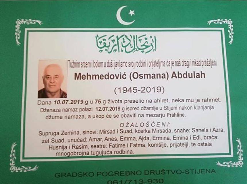 Tužnim srcem i bolom u duši, javljamo rodbini i prijateljima da je dana 10.07.2019 god. u 75. godini života preselio na Ahiret naš dragi Mehmedović (Osmana) Abdulah.