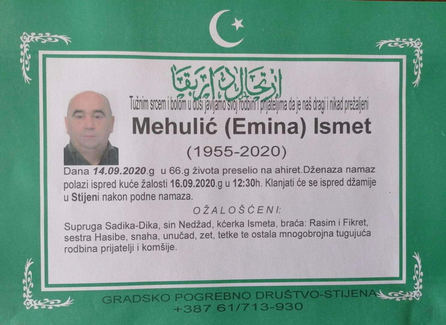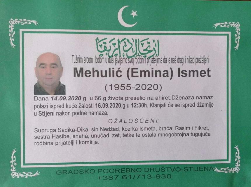 Tužnog srca i s bolom u duši obavještavamo rodbinu, komšije i prijatelje da je naš dragi Mehulić (Emina) Ismet preselio na Ahiret, dana 14. septembra 2020. godine, u 66. godini života.