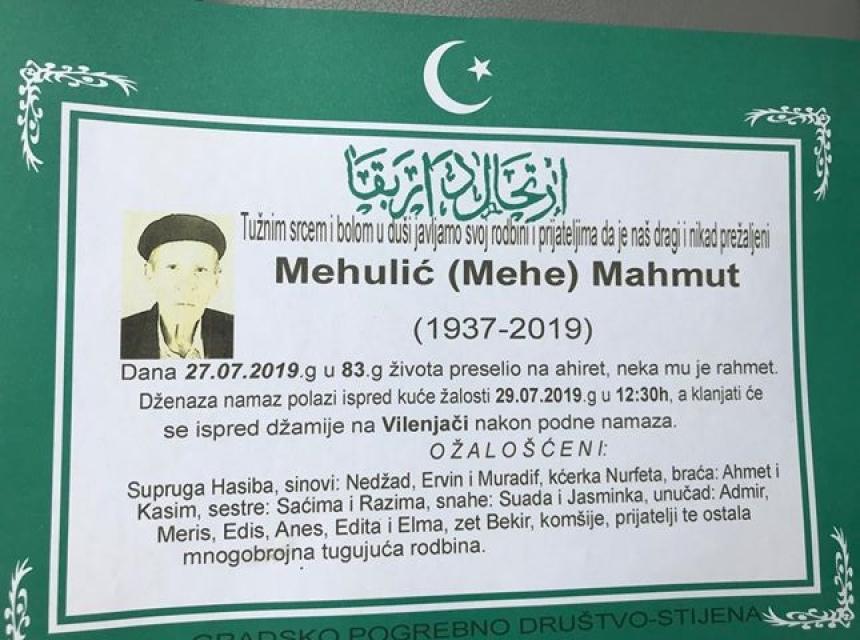 Tužnim srcem i bolom u duši javljamo rodbini prijateljima da je naš dragi i nikad prežaljeni Mehulić (Mehe) Mahmut dana 27.07.2019.g. u 83. g života preselio na Ahiret, neka mu je rahmet. Dženaza namaz polazi ispred kuće žalosti 29.07.2019.g u 12:30h, a klanjanjti će se ispred džamije na Vilenjači nakon podne namaza.