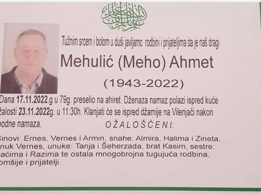 Tužnim srcem i bolom u duši javljamo rodbini i prijateljima da je naš dragi Mehulić (Meho) Ahmet, dana 17.11.2022. godine u 79-oj godini života, preselio na Ahiret.