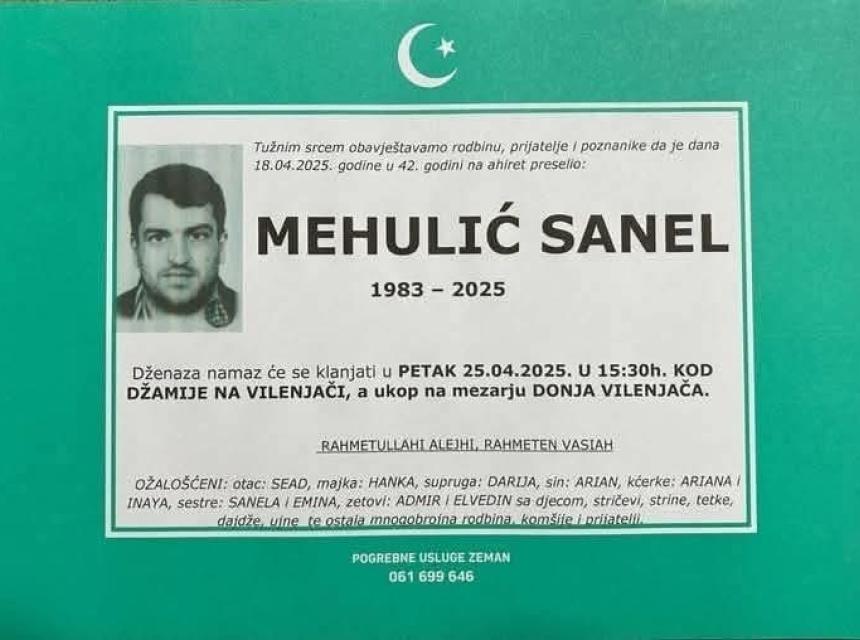 Dženaza namaz će se klanjati u PETAK 25.04.2025. u 15:30h. KOD DŽAMIJE NA VILENJAČI, a ukop na mezarju DONJA VILENJAČA.