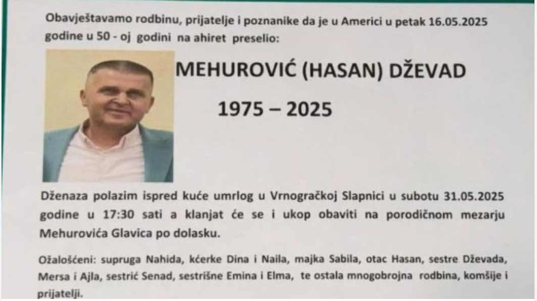Obavještavamo rodbinu i prijatelje da je 16. maja u Americi na Ahiret u 50. godini života preselio Mehurović (Hasana) Dževad.