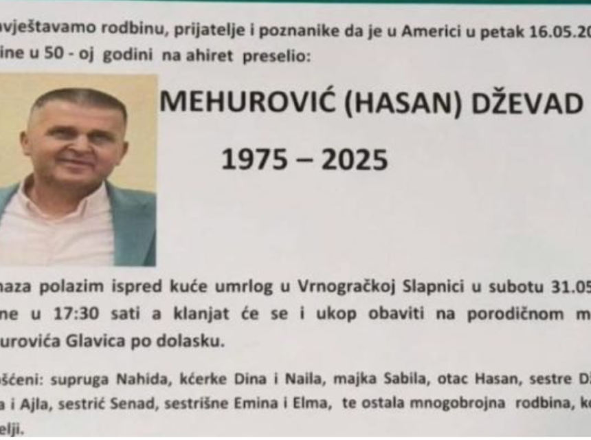 Dženaza polazi u subotu, 31. maja ispred kuće umrlog u Vrnogračkoj Slapnici u 17.30h, a klanjaće se i ukop obaviti na porodičnom mezarju Mehurovića Glavica, po dolasku.