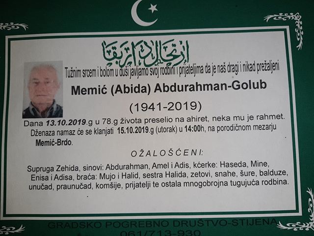 Tužnim srcem i bolom u suši javljamo rodbini, prijateljima, komšijama i poznanicima da je dana 13.10.2019. godine u 78. godini života na Ahiret preselio Memić (Ragiba) Abdurahman-Golub.